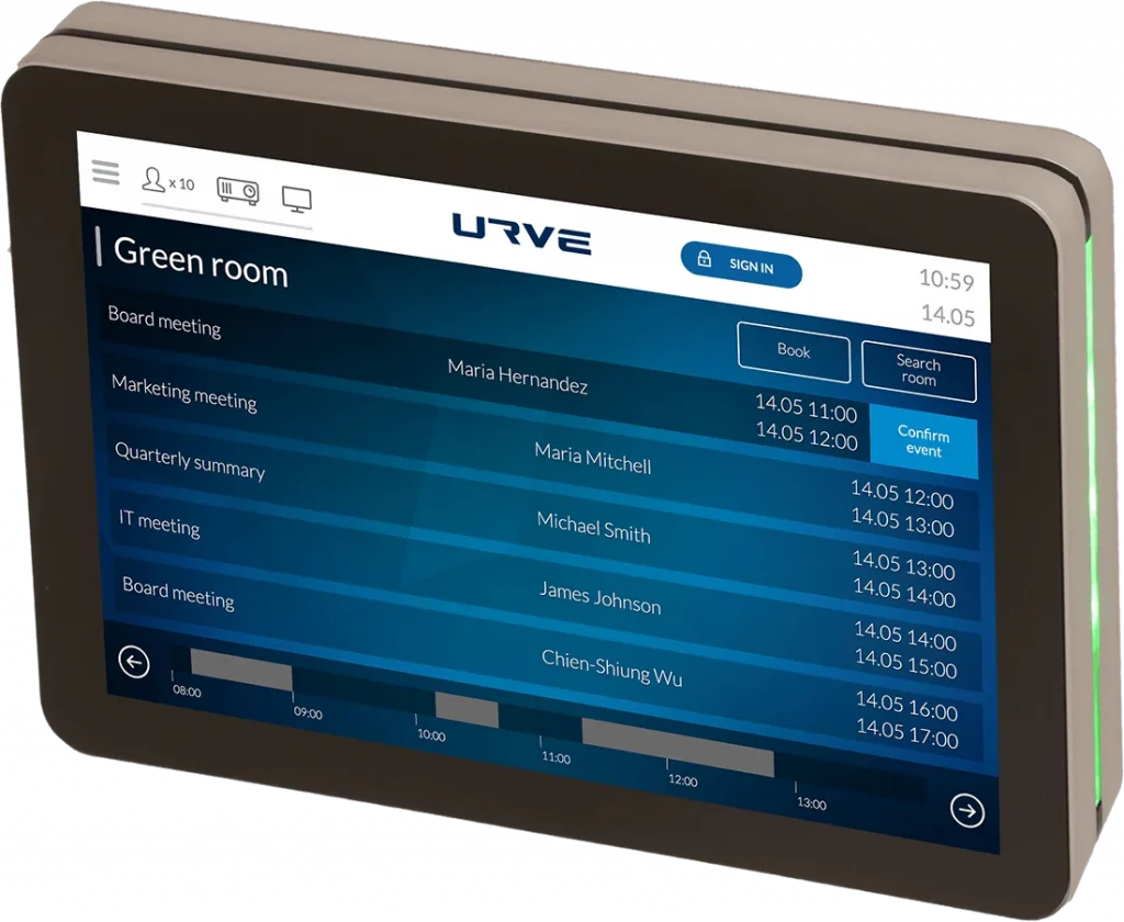 Aplikacja rezerwacji sal konferencyjnych URVE wspiera szeroką gamę urządzeń, co zapewnia elastyczność w doborze rozwiązań technicznych. System współpracuje z dedykowanym oprogramowaniem do zarządzania rezerwacjami, które umożliwia administratorom i użytkownikom sprawne zarządzanie dostępnością sal konferencyjnych oraz przestrzeni biurowej. Tablety zamontowane przy wejściu do sal wyświetlają aktualny kalendarz spotkań i umożliwiają rezerwację ad-hoc. Panele dotykowe o większych rozmiarach mogą pełnić funkcję digital signage, wyświetlając dodatkowo informacje firmowe, komunikaty czy prezentacje. Aplikacje mobilne są dostępne zarówno na platformy iOS, jak i Android, zapewniając spójne doświadczenie użytkownika niezależnie od używanego urządzenia. Użytkownicy mogą zarządzać rezerwacjami z dowolnego miejsca na świecie, korzystając z aplikacji mobilnej lub przeglądarki internetowej, co zwiększa elastyczność i mobilność pracy.